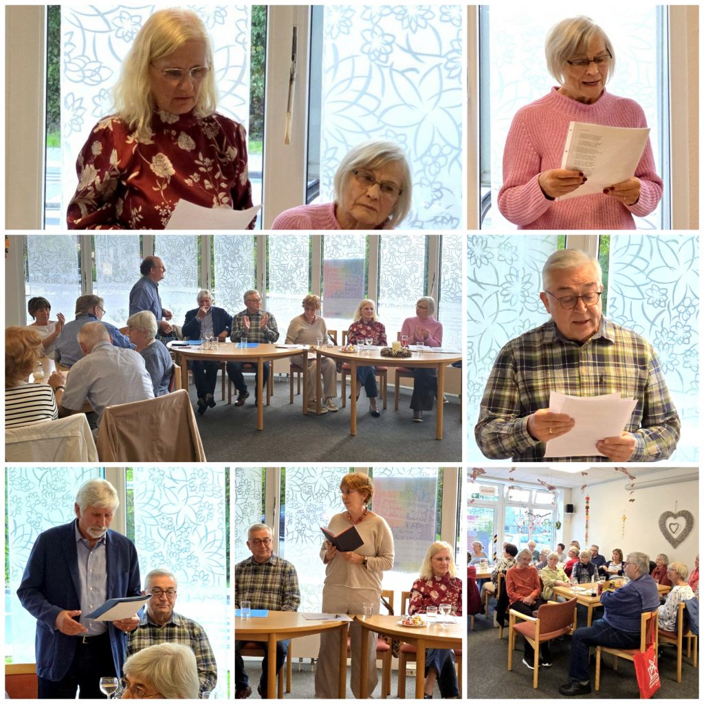 Im neunten Jahr ihres Bestehens veranstaltete die Zwar-Baumberg-Literaturgruppe „Wir schreiben selbst“ wieder einen Leseabend im Begegnungsraum des Gertrud-Borkott-Hauses. Mit 37 Personen war der Raum bestens belegt. Peter Cafitz führte informativ und kurzweilig durch den zweieinhalbstündigen Abend, der unter dem Titel „Kaleidoskop“ stand. Vom AWO-Haus wurden Getränke, auch Wein, sowie Kaffee und Kuchen ansprechend, in bunter Herbst-Deko, bereitgestellt. Die eigenen Texte wurden in lockerer Stimmung und loser Reihenfolge vorgetragen.